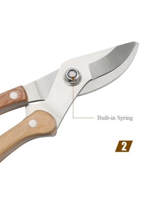 Škare za obrezivanje imaju ugrađenu visoko fleksibilnu čeličnu oprugu koja se automatski otvara i jednostavna je za uporabu. Ergonomski oblikovana drvena ručka bolje pristaje uz zakrivljenost dlanova, mekana je i ne klizi, zbog čega ćete se osjećati udobnije. Cijele škare imaju dobru otpornost na udarce, što može učinkovito ublažiti vibracije koje izaziva obrezivanje i smanjuje zamor ruku prilikom uporabe.